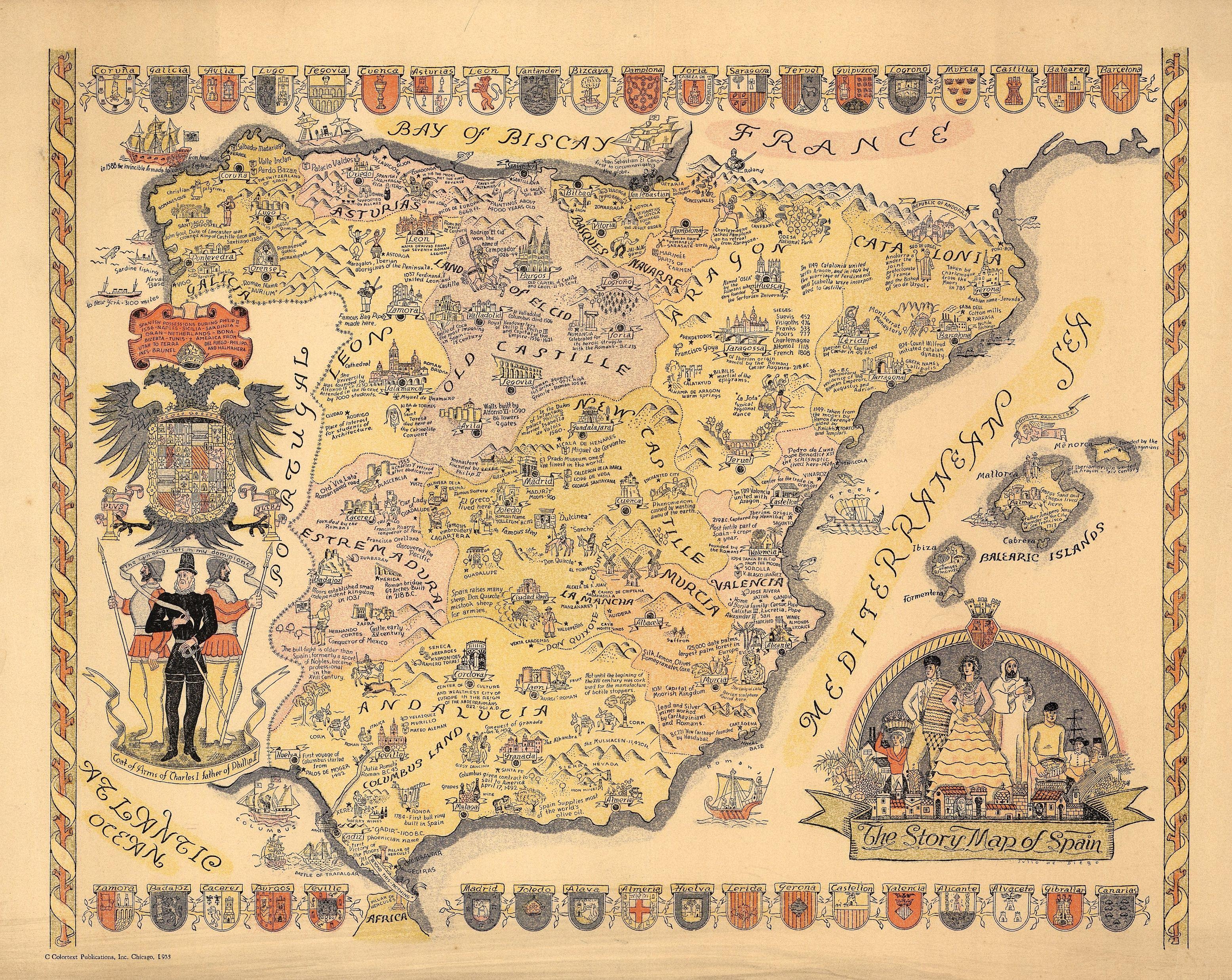 The appearance of modern humans (H. sapiens) in Spain after 35,000 BCE opened a new era, during which material culture acquired an innovating velocity it never lost. Flint tools became more varied and smaller, and bone and antler were used for harpoons, spears, and ornaments. Needles from El Pendo Cave (Cantabria) hint at sewn clothing of furs and skins as its mentioned in the vintage Spain map. Most remarkable were the intellectual achievements, culminating in the Paleolithic (Old Stone Age) caves found in the Cantabrian Mountains of northern Spain.