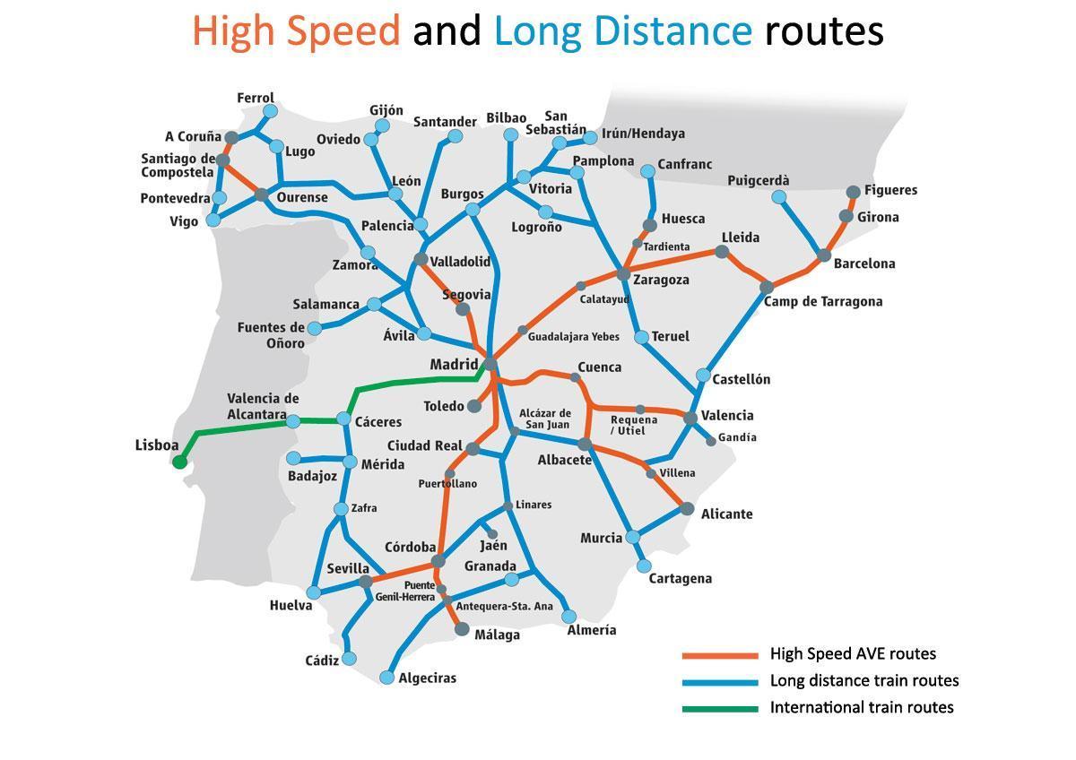 Spain high speed train map. Spain high speed rail map (Southern Europe - Europe) to print. Spain high speed rail map (Southern Europe - Europe) to download. The Spanish high speed rail system is called AVE. (Alta Velocidad Española, Spanish High Speed). The logo incorporates a feature which resembles a bird (ave in Spanish). The high speed rail lines are built to the standard European gauge (1435 mm) as its shown in Spain high speed rail map. The newer high-speed (AVE) network, however, has been built to the international standard gauge of 1435 mm in anticipation of its eventual connection to the rest of the European railway system. For this reason, the 1435-mm gauge is generally termed "European gauge" in Spain.