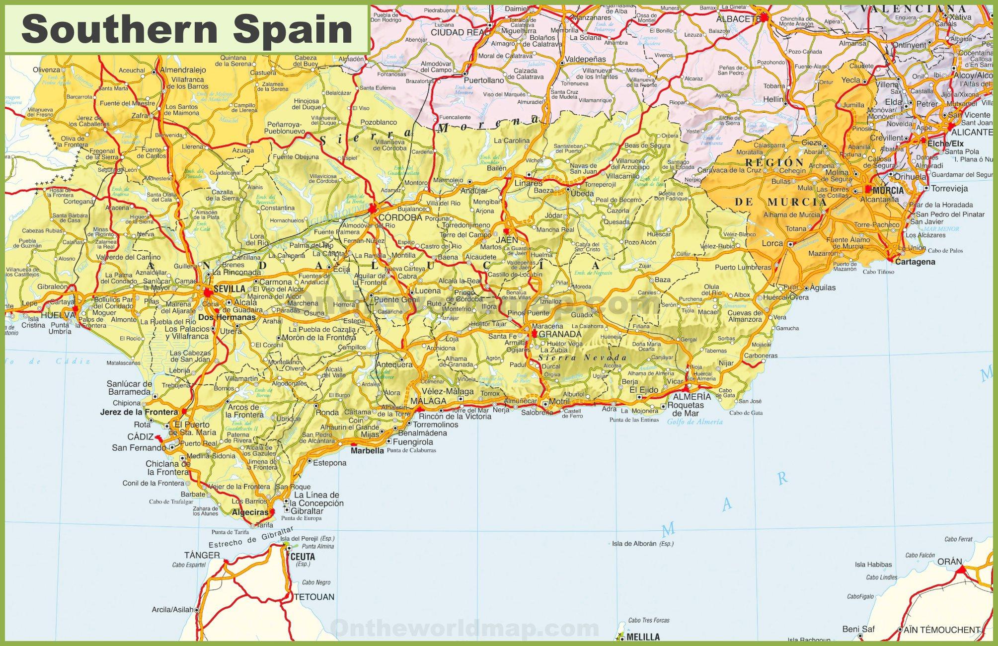 Detailed map of southern Spain. Map of southern Spain (Southern Europe - Europe) to print. Map of southern Spain (Southern Europe - Europe) to download. Andalusia is an autonomous community that covers most of southern Spain. It has a diverse landscape, with a long Mediterranean coastline and its own mountain chain, and is known to have the hottest average temperatures in Europe. Andalusia as its shown in the map of southern Spain is a rough translation of an Arabic word meaning “vandals”, due to the fact that it was raided and claimed by many different cultures and nations because of its prime location. This has created a series of cities and towns with a very multicultural architecture, cuisine, and history. They are home to a celebratory culture full of festivals and flamenco dancing, tapas and sherry.