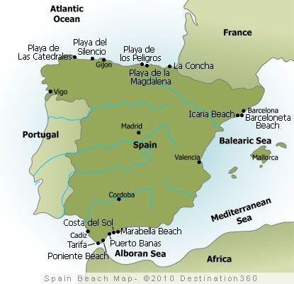 Map of Spain beaches. Spain beaches map (Southern Europe - Europe) to print. Spain beaches map (Southern Europe - Europe) to download. Spain has around 5,000 kilometers of varied coastline, so whichever coast you decide to enjoy your holidays you can be sure there will be a perfect beach for you to enjoy. There are currently 566 blue flag beaches, that is one in every five beaches in Spain as its shown in Spain beaches map. The Blue Flag uses numerous criteria before awarding a beach blue flag status, these include location, water quality, life-saving services, public toilets,sign-posting, distance to parking, distance to hotels, sustainable management, recycling bins and water sports activities. Spanish beaches come in all shapes and sizes, from secluded coves surrounded by pine-covered cliffs to wide, crowded spaces lined with plenty of restaurants and resorts.