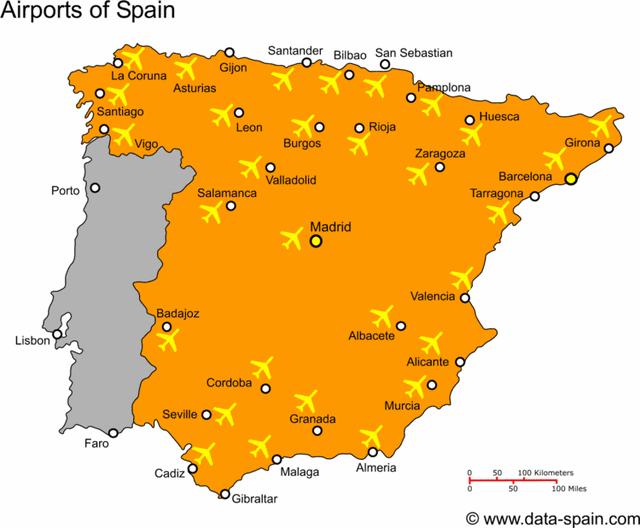 Spain map airports. Map of Spain airports (Southern Europe - Europe) to print. Map of Spain airports (Southern Europe - Europe) to download. Spain is one of the top 3 most popular tourist destinations in Europe. Therefore, no wonder there are so many international airports connecting the country to all parts of Europe, but to the other parts of the world as well. Spain has a large number of airports that offer both Domestic and International flights. The largest airports in Spain as its shown in the map of Spain airports are Madrid Barajas Airport, Barcelona Airport and Palma de Mallorca Airport. All three airports have a place in the top 25 busiest airports in Europe. The Spanish aviation authority AENA has one official website for all Spanish airports.